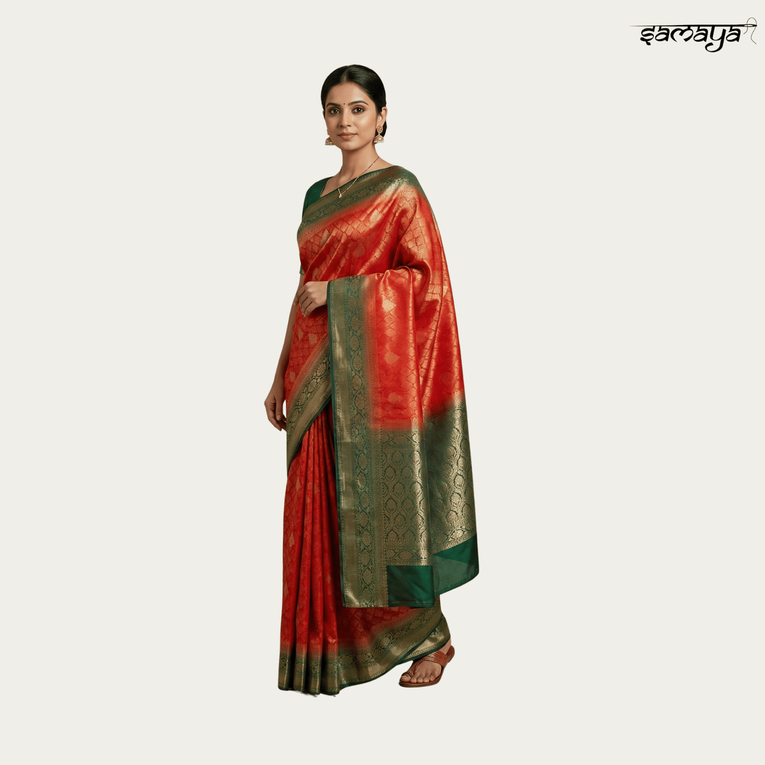 Green Red Soft Silk Saree with Gold Zari for Wedding Wear